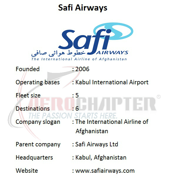 Dubai and Kabul-based Safi Airways Co is the first and largest privately-owned airline from Afghanistan. It is a subsidiary of the Safi Group and was founded in 2006 by its current Chairman and CEO, Ghulam Hazrat Safi. The airline has its headquarters in Shahr-e-Naw, Kabul, Afghanistan, an administrative office in the Dubai Airport Free Zone, and a downtown ticketing office in Deira, Dubai, United Arab Emirates. It is the first Afghan airline to operate in compliance with EASA (European Aviation Safety Agency) requirements, IOSA (IATA Operational Safety Audit) and ICAO (International Civil Aviation Organization).