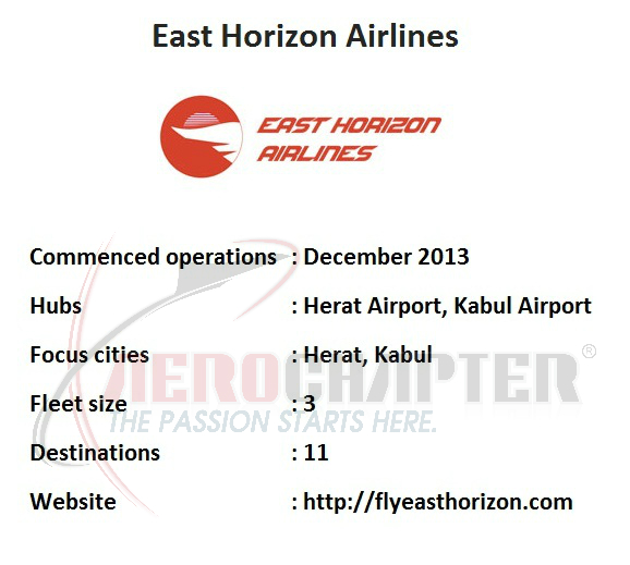 East Horizon Airlines is an Afghan airline which began operation in December 2013. As of May 2014 the airline had regularly scheduled flights to nine airports from its hubs at Herat and Kabul airports.